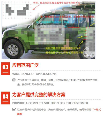 多年經(jīng)驗(yàn)偽裝波段范圍:可見(jiàn)光(380nm~760nm)和近紅外(760nm~1200nm); 外墻迷彩漆不是水漆。盡管水漆是一種環(huán)保型的涂料,;